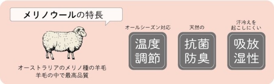 一年を通して羊の体を厳しい環境から守っているウールは、高い保温性・吸湿性・防臭性に優れています。 また、抗菌性・静電気防止など、たくさんの機能から、アウトドア用品にも重宝されている素材です。