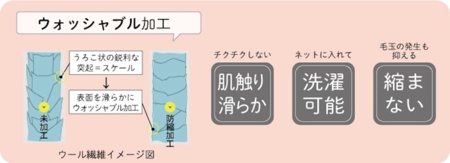 そのメリノウールをウォッシャブル加工(防縮加工)することで、ウール特有のチクチクとした肌ざわりや毛玉の発生を抑えることができます。