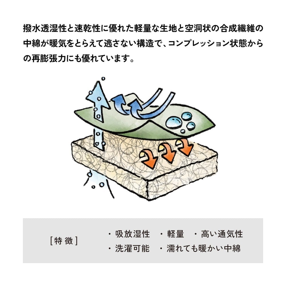 ●中綿には再膨張力に優れた「ISOFIBRE」を使用。シリコーン処理を施した空洞状の合成繊維は空洞部に暖気を捉えて逃しません。