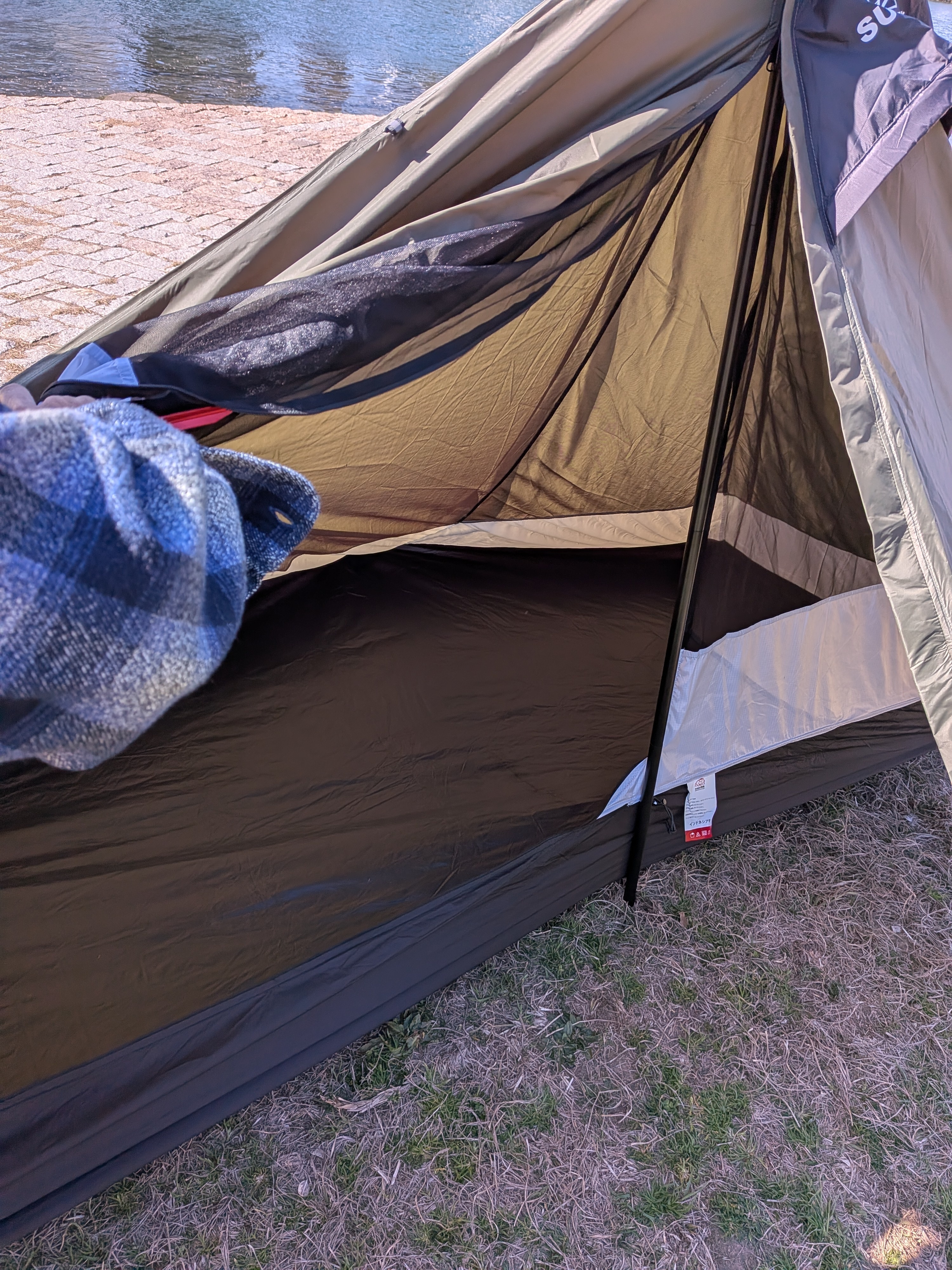 また、前述のサブポールを足元部分に差し込むことで内部空間が広くなり、このタイプのソロテントとしては居住性も悪くないレベルです。