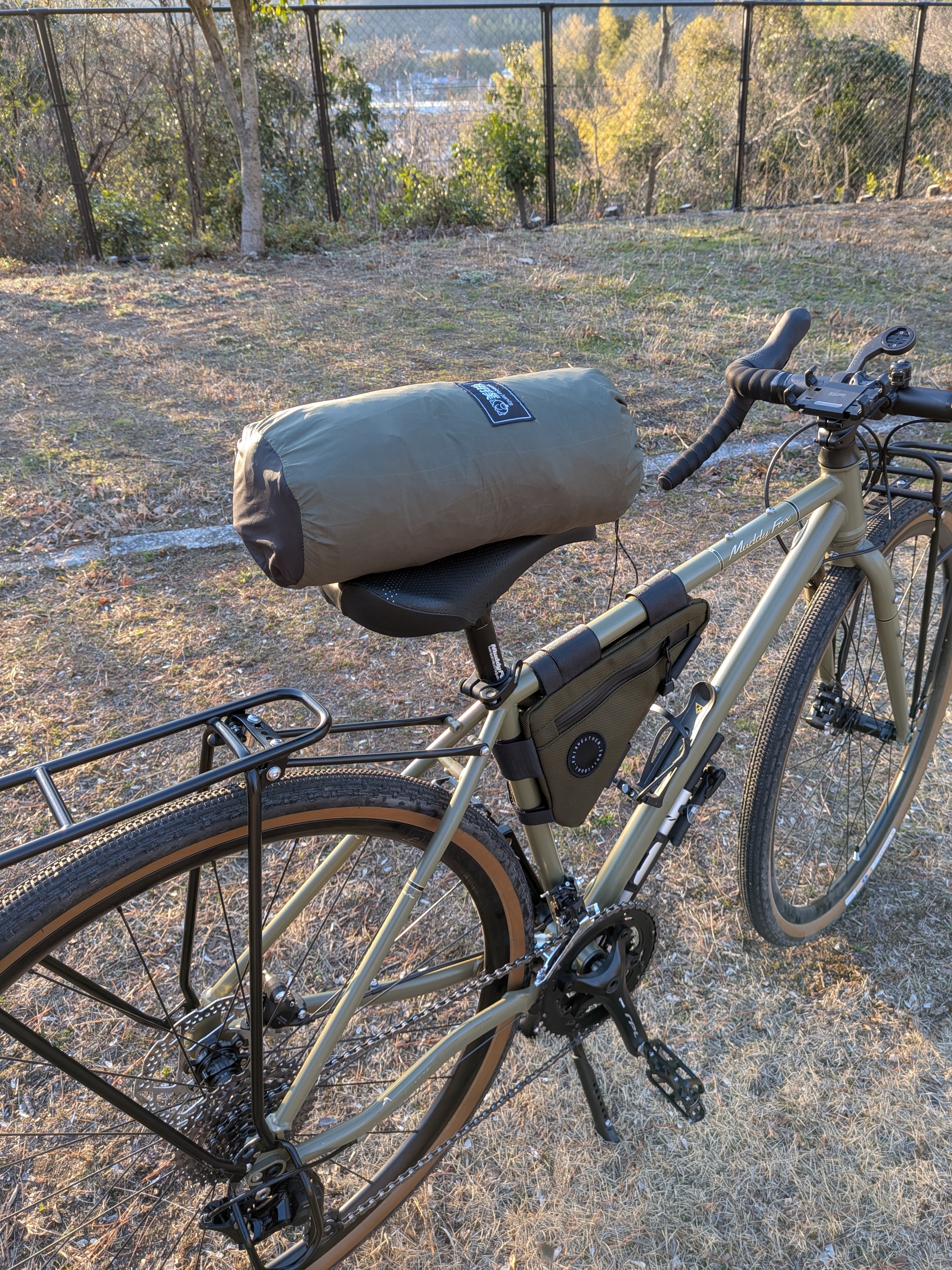 狭めのドロップハンドルの間にもじゅうぶん収まるので、本当にラフにハンドルに括り付けて出かけるのも有りだと思います。